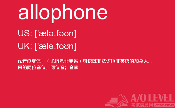 英国a-level入学考试的机会真的很少,每年就5-6月和10-11月两场考试。所以千万别因为不必要的原因,影响了a-level入学考试。为了让大家更好的在英国留学,a/o-level考试网会为大家带来a-level考试相关的资讯,一起来看看a/o-level考试网今天带来的词汇allophone的解析。如果您想了解alevel有什么科目,alevel考试地点,alevel去哪考试在中国,alevel自学考几门等关于a-level考试的相关资讯,请继续浏览并关注课窝a/o-level考试网。