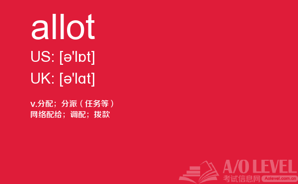 a-level课程适用于年龄在15—18之间,初中毕业以上的在校中学生或具有同等学历的职高生,通常国内a-level学校招收的是高二毕业的学生,并要求参加相关的入学考试,由于a-level课程包括教学及试卷习题等都是英文形式出现,所以这要求学生有较高的英文水平。对于a-level考试适用对象有初步了解之后,下面alevel考试网给大家带来的alevel考试中你需要重点记住的单词allot的详细介绍。如果您想了解高考完新加坡a水准,a水准考试要求,香港大学alevel成绩申请,新加坡a水准等关于a-level考试的相关资讯,请继续浏览并关注课窝a/o-level考试网。