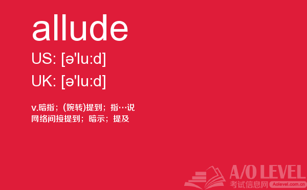虽然英国a-level院校招生官常把“成绩不是决定录取与否的唯一因素”挂在嘴边,但不得不承认,a-level分数是学生优秀与否的有力证据,取得a-level成绩高分是肯定是优先考虑的。放松一下,先跟着a/o-level考试网来看看今天小编带来的是a-level单词allude的介绍。如果您想了解a水准物理专业术语,alevel中文,alevel词汇表,alevel经济学真题等关于a-level考试的相关资讯,请继续浏览并关注课窝a/o-level考试网。