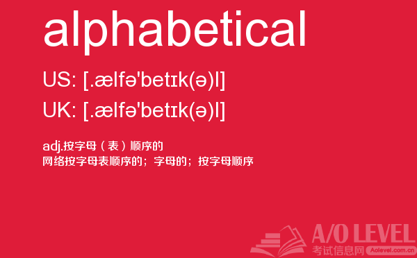 a- level课程一般在中国开设数学、进阶数学(或称高等数学)、物理、计算机学、会计学、商业学、经济学等课程供学生选择。那么关于alevel考生应该选哪些alevel课程呢?以后会给大家详细介绍,今天a/o-level考试网主要给大家全面介绍a-level词汇中的alphabetical单词。如果您想了解alevel生物,alevel考试报名时间,考alevel多少钱,alevel阅读技巧等关于a-level考试的相关资讯,请继续浏览并关注课窝a/o-level考试网。
