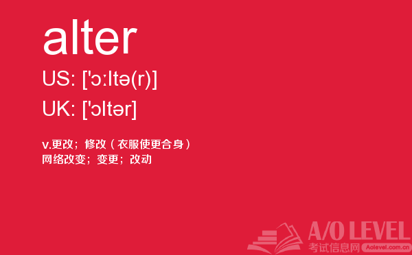 在a-level备考的过程中,想要冲刺到a-level写作的高分,相信大家都应该会知道,除了需要掌握a-level写作的一些技巧之外,优化文章中的词汇和句型也是冲刺高分的关键所在。也就是说,只有充分掌握了语法知识,才能让我们的的文章更为丰富形象。除了a-level写作,在a-level其他方面同学们也需要了解,下面课窝a/o-level考试网小编给大家带来a-level单词alter的介绍。如果您想了解alevel物理常备词汇,alevel官方网站,alevel数学公式,alevel培训学费等关于a-level考试的相关资讯,请继续浏览并关注课窝a/o-level考试网。