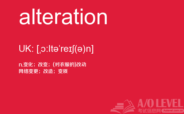 虽然英国a-level院校招生官常把“成绩不是决定录取与否的唯一因素”挂在嘴边,但不得不承认,a-level分数是学生优秀与否的有力证据,取得a-level成绩高分是肯定是优先考虑的。放松一下,先跟着a/o-level考试网来看看今天小编带来的是a-level单词alteration的介绍。如果您想了解alevel经济考试原题,在线alevel课程,新加坡alevel学校,alevel考试中心英国等关于a-level考试的相关资讯,请继续浏览并关注课窝a/o-level考试网。