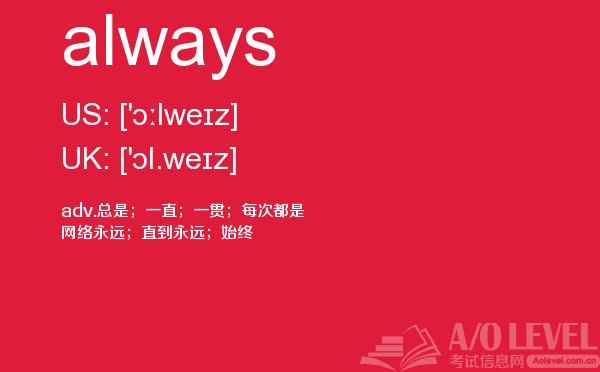 目前,a/olevel逐渐为人所熟知,很多学生都会主动了解alevel考试流程。同时也会抱怨a-level英语题比较难,任务重。那现在我们就放松一下,跟着a/o-level考试网小编来看看a-level考试中要积累的单词always,认真的学习积累。如果您想了解alevel考场地址,alevel中文考试真题,alevel物理常备词汇,alevel辅导等关于a-level考试的相关资讯,请继续浏览并关注课窝a/o-level考试网。