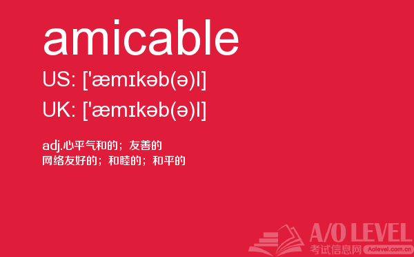 随着英国留学申请竞争的白热化,a-level成绩在学生个人简历中扮演的“入场券”角色,变得越来越重要。然而,在你参加a-level考试培训班前,你首先要对a-level考试有着一定的了解,一起跟着a/o-level考试网来看看小编今天带来a-level单词amicable的详细介绍。如果您想了解alevel是什么,alevel面试,alevel去哪考试在中国,alevel成绩等关于a-level考试的相关资讯,请继续浏览并关注课窝a/o-level考试网。