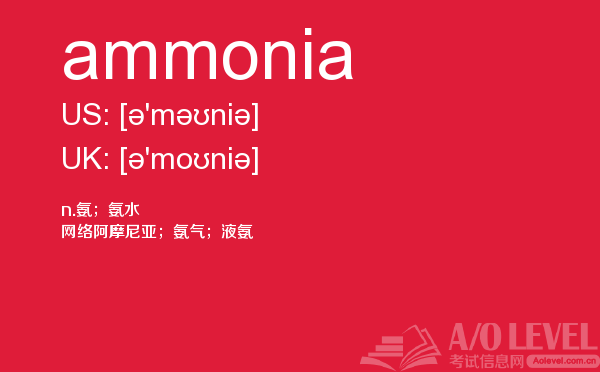 对于a-level考试,我们一再强调要加强a-level考试真题实战,多做英国a-level考试真题。放松一下,跟着a/o-level考试网来积累一下a-level考试中你会用到的单词ammonia,对你的a-level考试会有很大的帮助。如果您想了解爱德思alevel答案,alevel词汇下载,中国alevel考点,自学alevel申请大学等关于a-level考试的相关资讯,请继续浏览并关注课窝a/o-level考试网。
