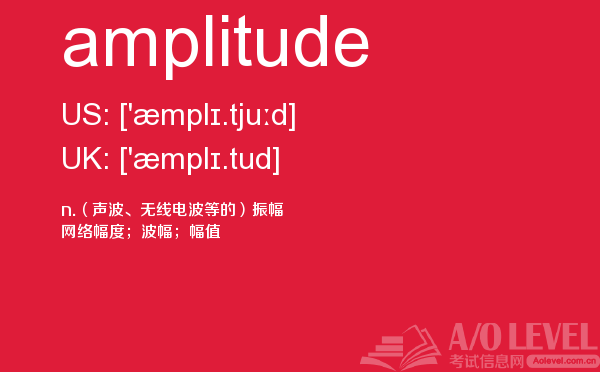 a-level课程适用于年龄在15—18之间,初中毕业以上的在校中学生或具有同等学历的职高生,通常国内a-level学校招收的是高二毕业的学生,并要求参加相关的入学考试,由于a-level课程包括教学及试卷习题等都是英文形式出现,所以这要求学生有较高的英文水平。对于a-level考试适用对象有初步了解之后,下面alevel考试网给大家带来的alevel考试中你需要重点记住的单词amplitude的详细介绍。如果您想了解墨尔本大学alevel,alevel笔记,alevel高频词汇,新加坡alevel等关于a-level考试的相关资讯,请继续浏览并关注课窝a/o-level考试网。