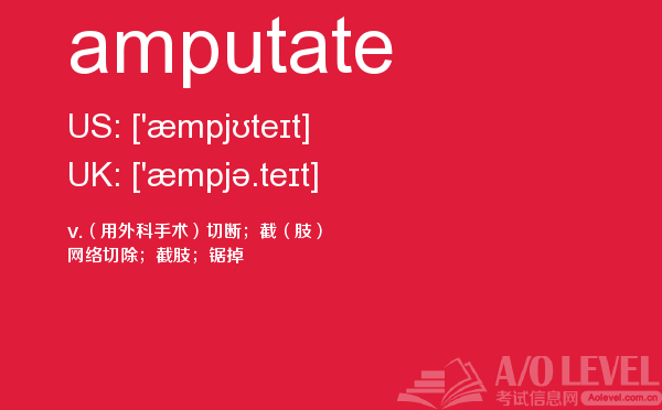 英国高中课程(a-level)的学制为两年:第一年称为as水准,学生通常选择自己最擅长且最有兴趣的3—4门课,通过考试后获得as证书。第二年称为a2水准,学生可选择as水准中优秀的3门课继续学习,通过考试后获得a-level证书。关于a-level学制相信大家肯定有一定的了解,今天alevel考试网想要带大家了解的并不是a-level学制的问题,想要介绍的是a-level重难点单词amputate,希望对大家有帮助。如果您想了解了解alevel辅导,alevel澳洲,爱德思alevel真题,alevel物理等关于a-level考试的相关资讯,请继续浏览并关注课窝a/o-level考试网。