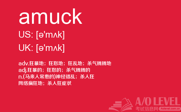 英国a-level考试是英国留学生去英国留学需要参加的考试,很多考生担心a-level考试分数要求高,英国a-level考试难度大,别担心,只要认真的学习a-level考试内容,小编相信大家一定能够考得a-level高分。今天a/o-level考试网给大家带来单词amuck的全面解析。如果您想了解alevel经济教材,alevel中文书目,alevel中文口语,a水准考试预备班怎么样等关于a-level考试的相关资讯,请继续浏览并关注课窝a/o-level考试网。