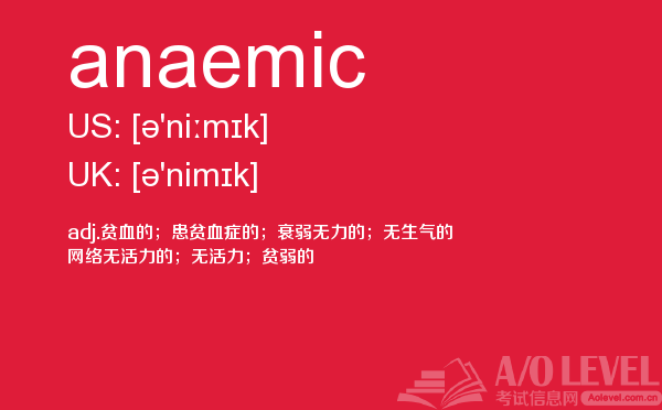 现在申请英国院校的中国孩子非常多,几乎每一个学生都在为一种叫做英国a-level的考试而努力着。a/o-level考试网老师为大家解析a-level考试重难点单词anaemic,大家认真学习,会有帮助。如果您想了解alevel物理中文,alevel考试数学试卷,alevel容易拿a的科目,alevel介绍等关于a-level考试的相关资讯,请继续浏览并关注课窝a/o-level考试网。
