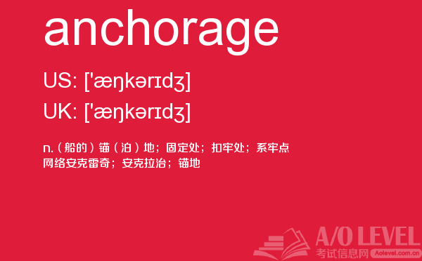 英国a-level考试是英国留学生去英国留学需要参加的考试,很多考生担心a-level考试分数要求高,英国a-level考试难度大,别担心,只要认真的学习a-level考试内容,小编相信大家一定能够考得a-level高分。今天a/o-level考试网给大家带来单词anchorage的全面解析。如果您想了解爱德思alevel答案,a水准成绩,新加坡a水准数学考试,alevel培训费等关于a-level考试的相关资讯,请继续浏览并关注课窝a/o-level考试网。