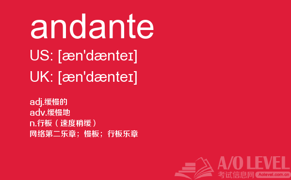 a-level课程证书被几乎所有英语授课的大学作为招收新生的入学标准。 在中国开设a-level课程旨在为中国学生提供进入国外大学的有效途径,具体目标为:培养在国内初高中成绩优秀的学生进入世界顶尖大学;培养在国内初高中成绩中等的学生进入世界一流大学;培养在国内初高中成绩一般的学生考取适合自己的大学。今天alevel考试网小编给大家详细解析a-level考试单词andante。如果您想了解中国alevel成绩申请国外名校,alevel数学名词,英国alevel成绩只有c,alevel申请条件等关于a-level考试的相关资讯,请继续浏览并关注课窝a/o-level考试网。