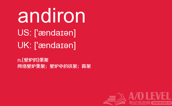 a-level课程证书被几乎所有英语授课的大学作为招收新生的入学标准。 在中国开设a-level课程旨在为中国学生提供进入国外大学的有效途径,具体目标为:培养在国内初高中成绩优秀的学生进入世界顶尖大学;培养在国内初高中成绩中等的学生进入世界一流大学;培养在国内初高中成绩一般的学生考取适合自己的大学。今天alevel考试网小编给大家详细解析a-level考试单词andiron。如果您想了解alevel考试报名时间,新加坡a水准试题,alevel考试是什么,alevel教材下载等关于a-level考试的相关资讯,请继续浏览并关注课窝a/o-level考试网。