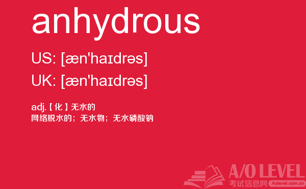 虽然英国a-level院校招生官常把“成绩不是决定录取与否的唯一因素”挂在嘴边,但不得不承认,a-level分数是学生优秀与否的有力证据,取得a-level成绩高分是肯定是优先考虑的。放松一下,先跟着a/o-level考试网来看看今天小编带来的是a-level单词anhydrous的介绍。如果您想了解alevel是什么意思,alevel课程怎么申请,alevel自学考几门,在线alevel辅导等关于a-level考试的相关资讯,请继续浏览并关注课窝a/o-level考试网。