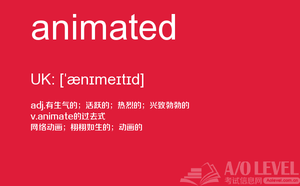 英国高中课程(a-level)的学制为两年:第一年称为as水准,学生通常选择自己最擅长且最有兴趣的3—4门课,通过考试后获得as证书。第二年称为a2水准,学生可选择as水准中优秀的3门课继续学习,通过考试后获得a-level证书。关于a-level学制相信大家肯定有一定的了解,今天alevel考试网想要带大家了解的并不是a-level学制的问题,想要介绍的是a-level重难点单词animated,希望对大家有帮助。如果您想了解alevel哲学,新加坡a水准考试,alevel课程能复读吗,中国alevel等关于a-level考试的相关资讯,请继续浏览并关注课窝a/o-level考试网。