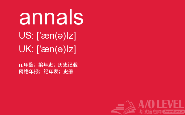 英国a-level入学考试的机会真的很少,每年就5-6月和10-11月两场考试。所以千万别因为不必要的原因,影响了a-level入学考试。为了让大家更好的在英国留学,a/o-level考试网会为大家带来a-level考试相关的资讯,一起来看看a/o-level考试网今天带来的词汇annals的解析。如果您想了解alevel经济教材,alevel经济分类,新加坡a水准考试条件,奥克兰大学alevel等关于a-level考试的相关资讯,请继续浏览并关注课窝a/o-level考试网。