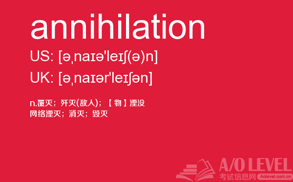 就读于国内学校的学生, 在申请英国学校时需要提交英国a-level考试成绩。很多考生因此英国a-level考试搞得头疼,放松一下,跟着a/o-level考试网来看看英国留学资讯吧!今天课窝a/o-level考试网小编给大家带来a-level考试重点词汇annihilation的全解,对你肯定有帮助。如果您想了解alevel是什么,alevel课程培训,alevel考试地点,新加坡a水准考试等关于a-level考试的相关资讯,请继续浏览并关注课窝a/o-level考试网。