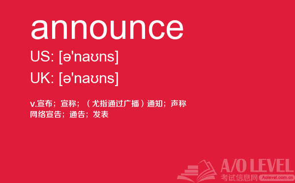 众多周知的英国a-level入学考试是进入英国院校的必经之路,所以我们自然不能小看,建议同学们能够加强a-level考试真题的练习,提前明确英国a-level考试报名的具体信息。为了提高考生们的英国a-level考试成绩,a/o-level考试网小编会每天给大家更新a-level留学资讯和alevel考试资讯,今天带来的是关于a-level考试词汇的单词全解,下面带你学习announce的用法。如果您想了解新加坡a水准优势,alevel评分标准,alevel化学还原氧化知识点,alevel考试备考等关于a-level考试的相关资讯,请继续浏览并关注课窝a/o-level考试网。