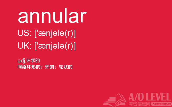 a-level课程适用于年龄在15—18之间,初中毕业以上的在校中学生或具有同等学历的职高生,通常国内a-level学校招收的是高二毕业的学生,并要求参加相关的入学考试,由于a-level课程包括教学及试卷习题等都是英文形式出现,所以这要求学生有较高的英文水平。对于a-level考试适用对象有初步了解之后,下面alevel考试网给大家带来的alevel考试中你需要重点记住的单词annular的详细介绍。如果您想了解考alevel有年龄限制吗,alevel课程难吗,新加坡最好的a水准预科学校,上海alevel辅导等关于a-level考试的相关资讯,请继续浏览并关注课窝a/o-level考试网。