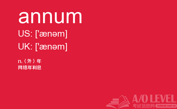 虽然英国a-level院校招生官常把“成绩不是决定录取与否的唯一因素”挂在嘴边,但不得不承认,a-level分数是学生优秀与否的有力证据,取得a-level成绩高分是肯定是优先考虑的。放松一下,先跟着a/o-level考试网来看看今天小编带来的是a-level单词annum的介绍。如果您想了解a水准物理专业术语,alevel中文,alevel词汇表,alevel经济学真题等关于a-level考试的相关资讯,请继续浏览并关注课窝a/o-level考试网。