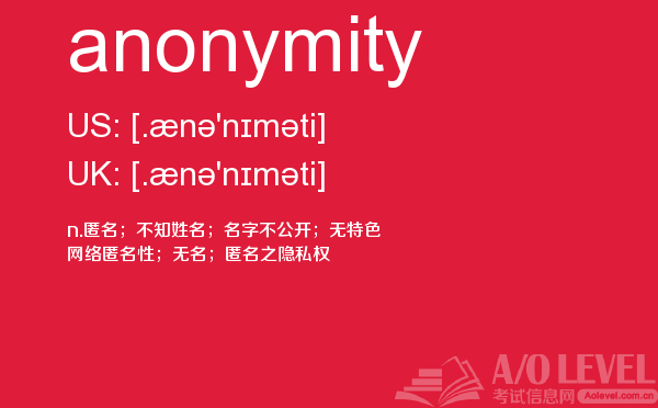 英国留学对于留学成绩的比拼越来越激烈,申请英国院校留学的一大指标a-level考试分数要求也水涨船高.虽然成绩只是申请的一部分,但不得不说,好看的英国a-level成绩是学生是否优秀的证据。放松一下跟着a/o-level考试网来学习一下a-level考试词汇anonymity的应用。如果您想了解alevel考试指南,alevel课程有年龄限制,alevel真题下载,英国alevel考试试卷等关于a-level考试的相关资讯,请继续浏览并关注课窝a/o-level考试网。