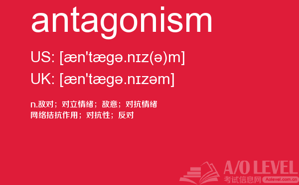 目前,a/olevel逐渐为人所熟知,很多学生都会主动了解alevel考试流程。同时也会抱怨a-level英语题比较难,任务重。那现在我们就放松一下,跟着a/o-level考试网小编来看看a-level考试中要积累的单词antagonism,认真的学习积累。如果您想了解alevel写作真题,上海alevel学校,alevel考试的考生年龄上限是多少,alevel费用等关于a-level考试的相关资讯,请继续浏览并关注课窝a/o-level考试网。