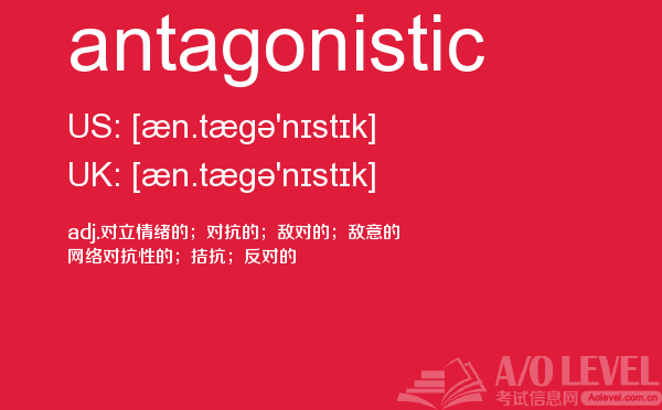英国a-level考试报名费很好解决,那怎样才能达到a-level考试词汇量要求呢?别再纠结于a-level考试分数要求了,今天我们来一起看看a/o-level考试网今天带给你的a-level单词antagonistic的讲解。如果您想了解alevel考试登记,南京alevel培训,alevel课程如何升大学,alevel是什么等关于a-level考试的相关资讯,请继续浏览并关注课窝a/o-level考试网。
