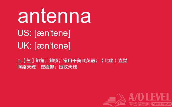 a-level课程适用于年龄在15—18之间,初中毕业以上的在校中学生或具有同等学历的职高生,通常国内a-level学校招收的是高二毕业的学生,并要求参加相关的入学考试,由于a-level课程包括教学及试卷习题等都是英文形式出现,所以这要求学生有较高的英文水平。对于a-level考试适用对象有初步了解之后,下面alevel考试网给大家带来的alevel考试中你需要重点记住的单词antenna的详细介绍。如果您想了解高考完新加坡a水准,a水准考试要求,香港大学alevel成绩申请,新加坡a水准等关于a-level考试的相关资讯,请继续浏览并关注课窝a/o-level考试网。