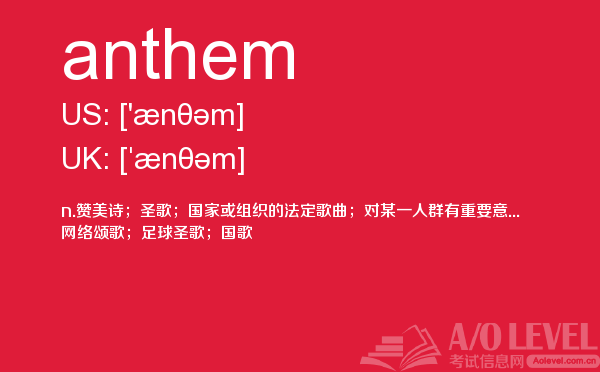 随著学生的素质提升,各大a-level课程培训班的师资和英国a-level题库也不断的完善,近年来学生考出来a-level分数也不断上涨。但是去英国留学,对英国留学资讯和英国的a-level考试资讯都是需要了解的,下面一起跟着a/o-level考试网来看看a-level词汇之anthem的详细介绍。如果您想了解在线alevel辅导,alevel时间,alevel写作,alevel化学知识点等关于a-level考试的相关资讯,请继续浏览并关注课窝a/o-level考试网。