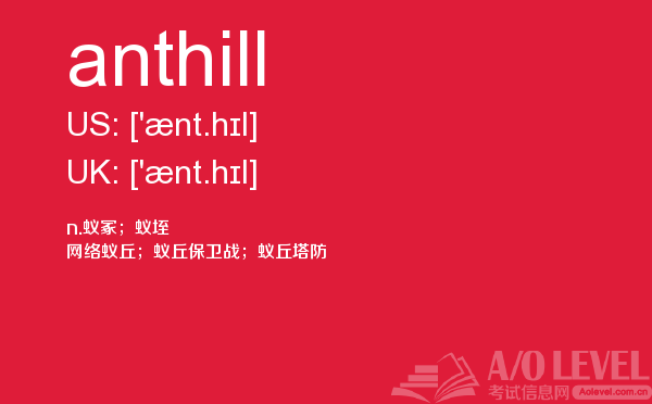 英国高中课程(a-level)的学制为两年:第一年称为as水准,学生通常选择自己最擅长且最有兴趣的3—4门课,通过考试后获得as证书。第二年称为a2水准,学生可选择as水准中优秀的3门课继续学习,通过考试后获得a-level证书。关于a-level学制相信大家肯定有一定的了解,今天alevel考试网想要带大家了解的并不是a-level学制的问题,想要介绍的是a-level重难点单词anthill,希望对大家有帮助。如果您想了解alevel培训中心,英国alevel排名,alevel历年真题,alevel官方网站等关于a-level考试的相关资讯,请继续浏览并关注课窝a/o-level考试网。