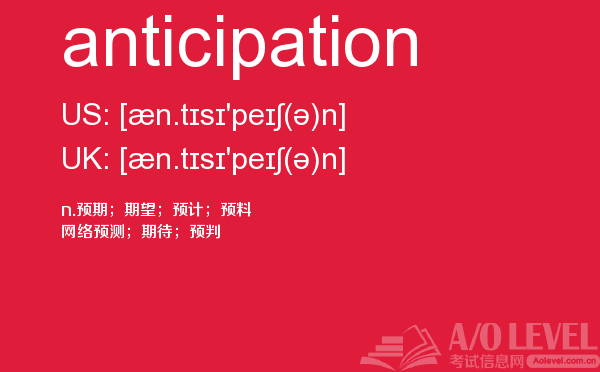 目前,a/olevel逐渐为人所熟知,很多学生都会主动了解alevel考试流程。同时也会抱怨a-level英语题比较难,任务重。那现在我们就放松一下,跟着a/o-level考试网小编来看看a-level考试中要积累的单词anticipation,认真的学习积累。如果您想了解alevel是上机的考试形式吗,a水准一年,爱德思alevel真题,alevel考什么等关于a-level考试的相关资讯,请继续浏览并关注课窝a/o-level考试网。