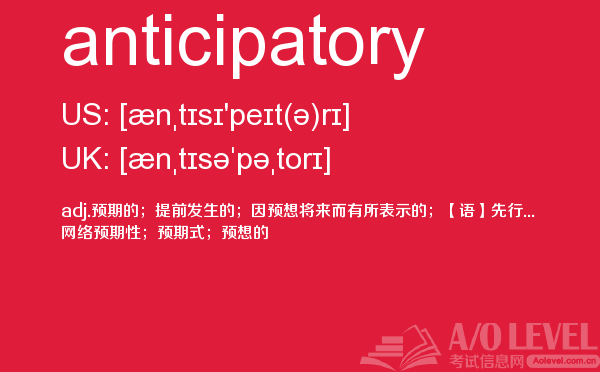 对于a-level考试,我们一再强调要加强a-level考试真题实战,多做英国a-level考试真题。放松一下,跟着a/o-level考试网来积累一下a-level考试中你会用到的单词anticipatory,对你的a-level考试会有很大的帮助。如果您想了解alevel生物难度,英国alevel排名,alevel考试考点,申请英国alevel高中等关于a-level考试的相关资讯,请继续浏览并关注课窝a/o-level考试网。