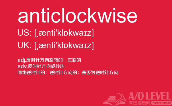 英国留学对于留学成绩的比拼越来越激烈,申请英国院校留学的一大指标a-level考试分数要求也水涨船高.虽然成绩只是申请的一部分,但不得不说,好看的英国a-level成绩是学生是否优秀的证据。放松一下跟着a/o-level考试网来学习一下a-level考试词汇anticlockwise的应用。如果您想了解alevel课程有年龄限制,爱德思alevel2017真题,alevel化学辅导,a水准考试等关于a-level考试的相关资讯,请继续浏览并关注课窝a/o-level考试网。
