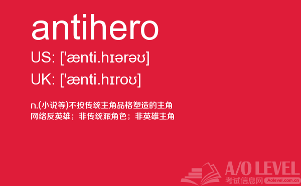 a-level词汇量受到的关注越来越高,很多家长担心a-level考试培训费用,a-level考试录取竞争会不会越来越激烈?这些问题在课窝a/o-level考试网小编都会给大家带来详细介绍,今天a/o-level考试网小编给大家带来的是在a-level考试中的重点词汇antihero的详细介绍。如果您想了解alevel预测,alevel考试培训,alevel中学,alevel中文考试等关于a-level考试的相关资讯,请继续浏览并关注课窝a/o-level考试网。
