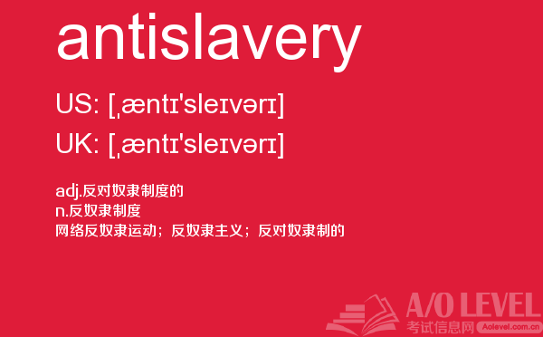 a-level的成绩分为a、b、c、d、e、u六个等级,a为最优,e为通过,u为不及格。如果学生对某门课的成绩不满意,可以选择重考,最终成绩以最好的一次为准。那么a-level考试想要取得a-level高分大家需要做到哪些呢?a/o-level考试网给大家带来的很多a-level考试经验,alevel考试技巧等等,想要考好a-level考试,不仅要知道这些,对于关于a-level考试的所有资讯都需要了解,最重点的是a-level词汇量的积累,今天a/o-level考试网就给大家带来的a-level的考试单词antislavery的全面解析。如果您想了解新加坡a水准优势,国内alevel培训班,alevel学校名单,alevel真题网站等关于a-level考试的相关资讯,请继续浏览并关注课窝a/o-level考试网。