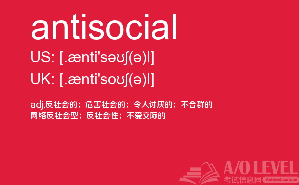 虽然英国a-level院校招生官常把“成绩不是决定录取与否的唯一因素”挂在嘴边,但不得不承认,a-level分数是学生优秀与否的有力证据,取得a-level成绩高分是肯定是优先考虑的。放松一下,先跟着a/o-level考试网来看看今天小编带来的是a-level单词antisocial的介绍。如果您想了解英国读alevel要缴纳什么费用,上海a水准培训,alevel成绩不好怎么办,英国alevel成绩只有c等关于a-level考试的相关资讯,请继续浏览并关注课窝a/o-level考试网。