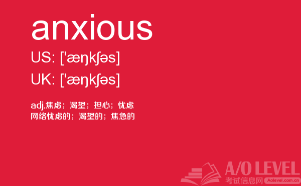 在a-level备考的过程中,想要冲刺到a-level写作的高分,相信大家都应该会知道,除了需要掌握a-level写作的一些技巧之外,优化文章中的词汇和句型也是冲刺高分的关键所在。也就是说,只有充分掌握了语法知识,才能让我们的的文章更为丰富形象。除了a-level写作,在a-level其他方面同学们也需要了解,下面课窝a/o-level考试网小编给大家带来a-level单词anxious的介绍。如果您想了解爱德思alevel申请大学,爱德思alevel考试答案,alevel数学公式,alevel中国等关于a-level考试的相关资讯,请继续浏览并关注课窝a/o-level考试网。