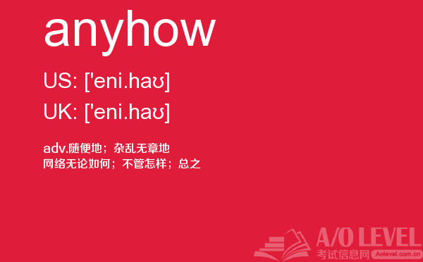 英国a-level考试是英国留学生去英国留学需要参加的考试,很多考生担心a-level考试分数要求高,英国a-level考试难度大,别担心,只要认真的学习a-level考试内容,小编相信大家一定能够考得a-level高分。今天a/o-level考试网给大家带来单词anyhow的全面解析。如果您想了解alevel到底是什么课程,alevel考试要求,新加坡a水准好考吗,alevel网课等关于a-level考试的相关资讯,请继续浏览并关注课窝a/o-level考试网。