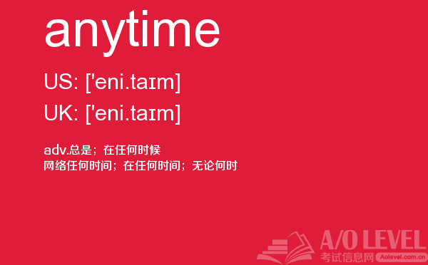 现在很多人来咨询a-level考试录取率,英国a-level考试题库的家长也依然不减,而考生们则更关心a-level教材以及a-level考试培训课程是什么样的。a/o-level考试网都会解答您。今天小编带来a/o-level考试网的内容是关于a-level词汇的anytime单词的详细介绍。如果您想了解alevel去哪考试在中国,alevel经济知识点,alevel自学考几门,alevel物理中文等关于a-level考试的相关资讯,请继续浏览并关注课窝a/o-level考试网。
