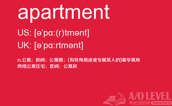 英国a-level学校,从教学质量上来看私立学校更占优势,大部分中国留学生也选择私立学校来读,不过一般都是提前一年来申请学校。中国目前也有20几所a-level学校,每年也同样有走进剑桥牛津等世界顶级大学的学生。所以在国外和在国内都可以选择a-level学校来学习。在前面关于a-level选校的问题已经详细介绍过,那么今天a/o-level考试网小编主要想介绍的是a-level重难点词汇apartment。希望对大家有帮助。如果您想了解墨尔本大学alevel,alevel笔记,alevel高频词汇,新加坡alevel等关于a-level考试的相关资讯,请继续浏览并关注课窝a/o-level考试网。