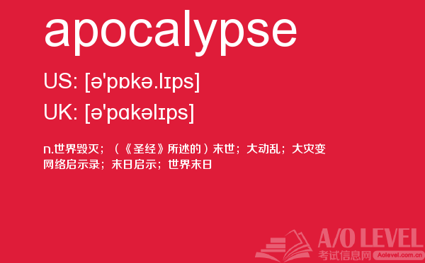 a-level课程适用于年龄在15—18之间,初中毕业以上的在校中学生或具有同等学历的职高生,通常国内a-level学校招收的是高二毕业的学生,并要求参加相关的入学考试,由于a-level课程包括教学及试卷习题等都是英文形式出现,所以这要求学生有较高的英文水平。对于a-level考试适用对象有初步了解之后,下面alevel考试网给大家带来的alevel考试中你需要重点记住的单词apocalypse的详细介绍。如果您想了解考alevel有年龄限制吗,alevel课程难吗,新加坡最好的a水准预科学校,上海alevel辅导等关于a-level考试的相关资讯,请继续浏览并关注课窝a/o-level考试网。