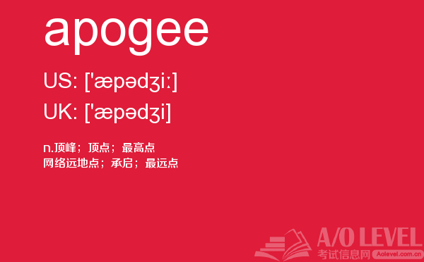 a-level词汇量受到的关注越来越高,很多家长担心a-level考试培训费用,a-level考试录取竞争会不会越来越激烈?这些问题在课窝a/o-level考试网小编都会给大家带来详细介绍,今天a/o-level考试网小编给大家带来的是在a-level考试中的重点词汇apogee的详细介绍。如果您想了解alevel学校条件,alevel中文试题,爱德思alevel,英国a水准等关于a-level考试的相关资讯,请继续浏览并关注课窝a/o-level考试网。