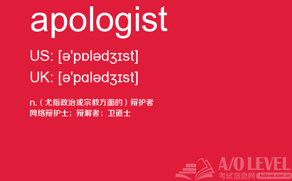 现在申请英国院校的中国孩子非常多,几乎每一个学生都在为一种叫做英国a-level的考试而努力着。a/o-level考试网老师为大家解析a-level考试重难点单词apologist,大家认真学习,会有帮助。如果您想了解alevel考试备考,alevel考试费用,alevel经济培训班,新加坡alevel考试时间等关于a-level考试的相关资讯,请继续浏览并关注课窝a/o-level考试网。