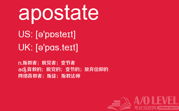 英国留学考试a-level考试考什么?a-level考试题型一定要注意积累和总结。课窝a/o-level考试网小编每天会给大家带来a-level考试的相关资讯,今天带来a-level单词apostate的解析,希望大家认真的积累a-level考试词汇。如果您想了解alevel考试大纲,英国alevel成绩只有c,爱德思alevels,中国alevel人数等关于a-level考试的相关资讯,请继续浏览并关注课窝a/o-level考试网。