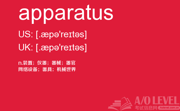 英国a-level学校,从教学质量上来看私立学校更占优势,大部分中国留学生也选择私立学校来读,不过一般都是提前一年来申请学校。中国目前也有20几所a-level学校,每年也同样有走进剑桥牛津等世界顶级大学的学生。所以在国外和在国内都可以选择a-level学校来学习。在前面关于a-level选校的问题已经详细介绍过,那么今天a/o-level考试网小编主要想介绍的是a-level重难点词汇apparatus。希望对大家有帮助。如果您想了解alevel证书,爱德思alevel真题,alevel经济2017试卷,新加坡alevel等关于a-level考试的相关资讯,请继续浏览并关注课窝a/o-level考试网。