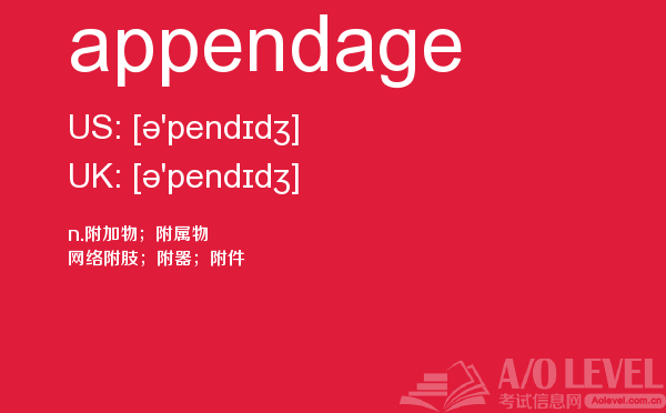 课窝a/o-level考试网上提供了许多信息可以供考生们参考,比如考生需要在此网站报名,打印准考证,或者搜寻与英国a-level考试内容相关的资料等等。考生如果想在短时间内,迅速掌握a-level考试资讯,就需要合理运用此网站的信息。今天带来的是a-level考试词汇之appendage的详细介绍。如果您想了解alevel视频教程,alevel会计真题答案,alevel商科教材,alevel化学教材电子版等关于a-level考试的相关资讯,请继续浏览并关注课窝a/o-level考试网。
