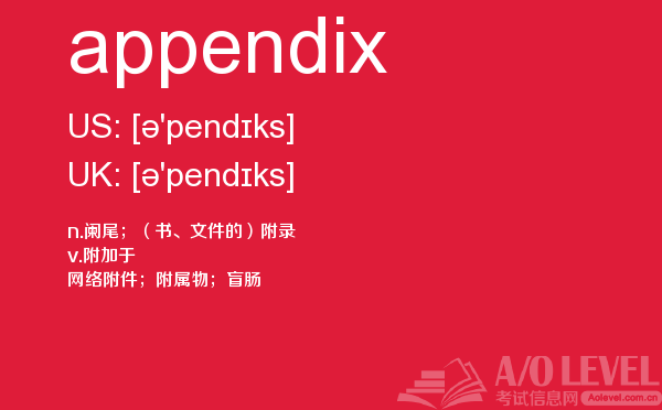 随着英国留学申请竞争的白热化,a-level成绩在学生个人简历中扮演的“入场券”角色,变得越来越重要。然而,在你参加a-level考试培训班前,你首先要对a-level考试有着一定的了解,一起跟着a/o-level考试网来看看小编今天带来a-level单词appendix的详细介绍。如果您想了解alevel考试机经,alevel真题试卷,alevel都有什么课程,alevel课程多久等关于a-level考试的相关资讯,请继续浏览并关注课窝a/o-level考试网。