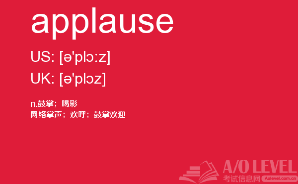 a-level课程证书被几乎所有英语授课的大学作为招收新生的入学标准。 在中国开设a-level课程旨在为中国学生提供进入国外大学的有效途径,具体目标为:培养在国内初高中成绩优秀的学生进入世界顶尖大学;培养在国内初高中成绩中等的学生进入世界一流大学;培养在国内初高中成绩一般的学生考取适合自己的大学。今天alevel考试网小编给大家详细解析a-level考试单词applause。如果您想了解alevel物理知识点,a水准物理专业术语,a水准考试试题,中国alevel考试等关于a-level考试的相关资讯,请继续浏览并关注课窝a/o-level考试网。