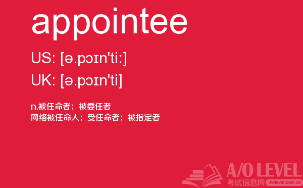a-level 的考试将由所属的考试委员会分别于每年5-6月和10-11月在全球统一组织,成绩分别在8月和次年2月公布。关于a-level考试时间的具体内容,alevel考试网前面详细介绍过,大家可以查找alevel考试网前面的a-level考试资讯,alevel考试网每天会更新大量的alevel考试资讯,本篇要给大家介绍a-level单词appointee的全面介绍。如果您想了解alevel香港中文大学,上海alevel培训班,中国alevel考点,alevel中文书目等关于a-level考试的相关资讯,请继续浏览并关注课窝a/o-level考试网。