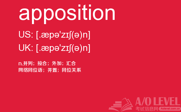 课窝a/o-level考试网上提供了许多信息可以供考生们参考,比如考生需要在此网站报名,打印准考证,或者搜寻与英国a-level考试内容相关的资料等等。考生如果想在短时间内,迅速掌握a-level考试资讯,就需要合理运用此网站的信息。今天带来的是a-level考试词汇之apposition的详细介绍。如果您想了解新加坡国立大学alevel,新加坡a水准学费,新加坡alevel考试时间,在新加坡读预科参加alevel考试等关于a-level考试的相关资讯,请继续浏览并关注课窝a/o-level考试网。
