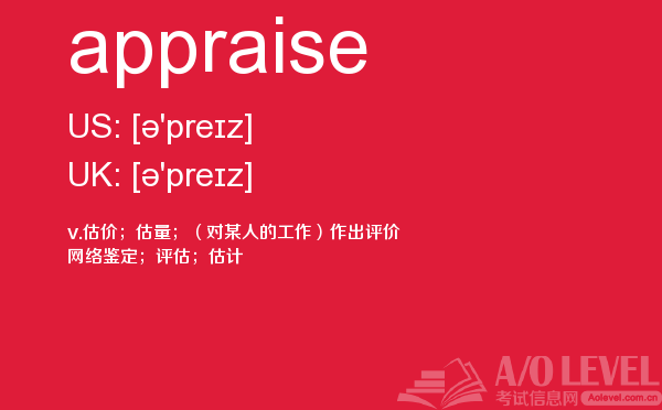 英国的大多数中学开设的alevel课程科目相当广泛,有文科、商科、经济、语言、数学、理科、计算、法律、媒体、音乐等。学生的alevel考试成绩及其所选修的a-level课程在很大程度上决定着能否进入理想的大学和学习所选择的学位课程。关于alevel考试alevel考试网会给大家带来和a-level考试相关的资讯,下面带来的是单词appraise的介绍,会对大家的a-level考试成绩有帮助。如果您想了解alevel排名,alevel培训价格,alevel数学公式表,alevel奖学金等关于a-level考试的相关资讯,请继续浏览并关注课窝a/o-level考试网。